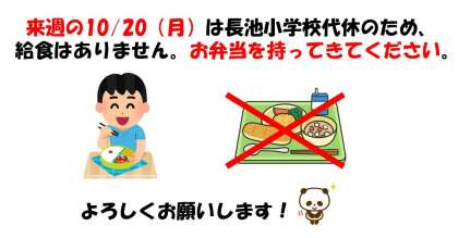 来週月曜日、10月20日は長池小学校が代休のため、給食がありません。お弁当が必要なので各自用意してください。よろしくお願いします。
