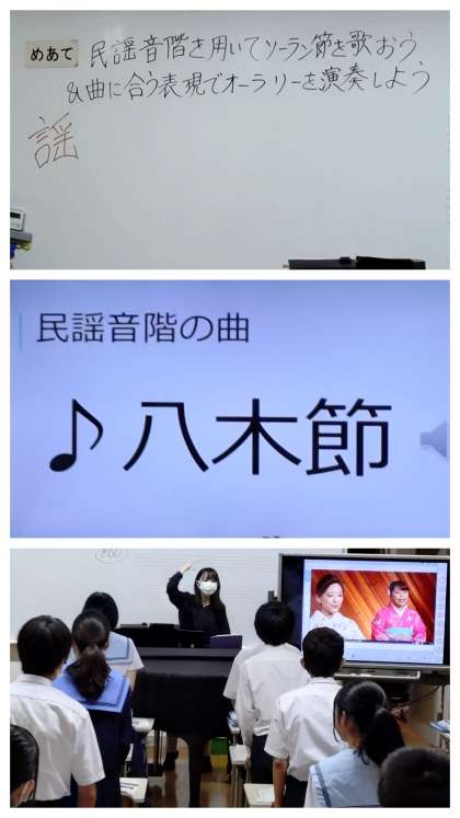 本日の授業のめあては「民謡音階を用いてソーラン節を歌おう&曲に合う表現でオーラリーを演奏しよう」でした。
