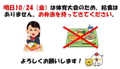 明日は体育大会のため、給食がありません。お弁当が必要なので各自用意してください。よろしくお願いします。