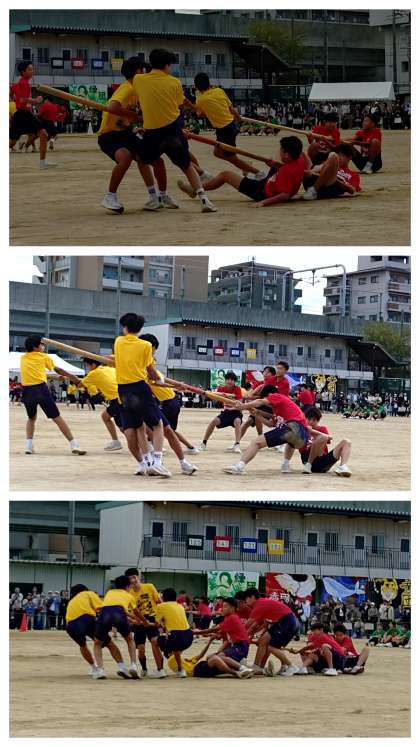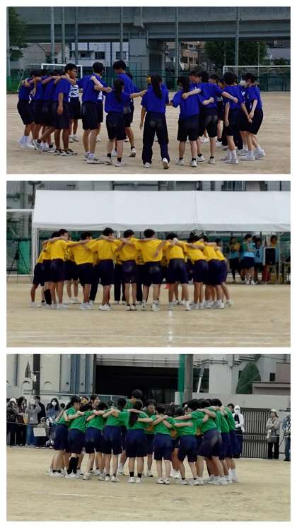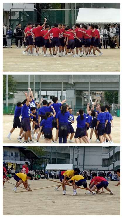 3年生団体競技『棒引き』の様子です。各団円陣を組んで「いざ、出陣!」