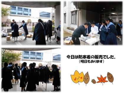 お昼休み、何やら通用門側のピロティ付近がにぎわっています。今日と明日は防寒着の販売日なので、生徒たちが購入したりサイズ合わせなどをしていたんですね。