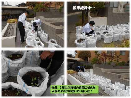 いっぽう、正門付近の昭和中ガーデンでは1年生が自分たちの植えた大根を見に来ています。しっかり観察記録中をしている生徒もいました。これからの成長が楽しみですね!