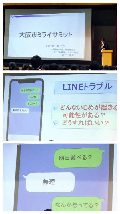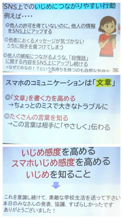 サミットの最後に、四辻准教授よりSNS上のLINEトラブルなどを防ぐためには、文章力や言葉をたくさん知ることなどの『スマホいじめ感度』を高めることや、『いじめの定義』をしっかりと理解しておくことなどのご助言がありました。「ありがとうございました!」