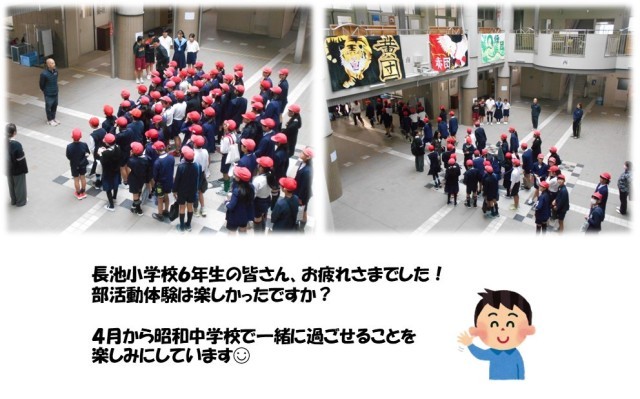 各クラブでは先生や中学生のお兄さんお姉さんに教えてもらいながら、色々な体験ができたと思います。短い時間でしたが、昭和中学校のことを少しでもわかってもらえたなら嬉しいです。4月から一緒に過ごせることを楽しみにしています!