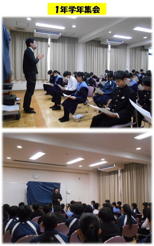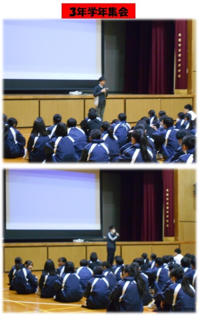 1時間目は各学年で集会が行われました。冬休みを迎えるにあたり、学習面や生活面で気をつけておくことなどを先生方がお話してくださいました。どの学年も話を聞く姿勢はとても素晴らしかったです(拍手)。あとは、今日聞いたいろいろなお話を「他人事(ひとごと)」ではなく、「自分事(じぶんごと)」としてとらえることができるかどうかが大切です。これからの皆さんの行動に期待しています!