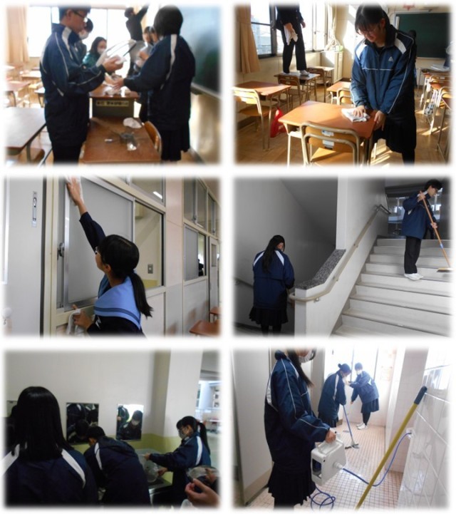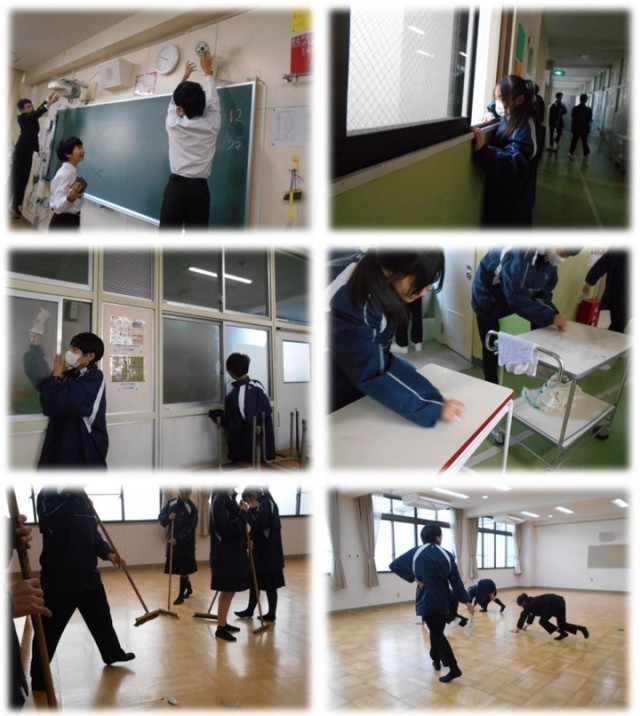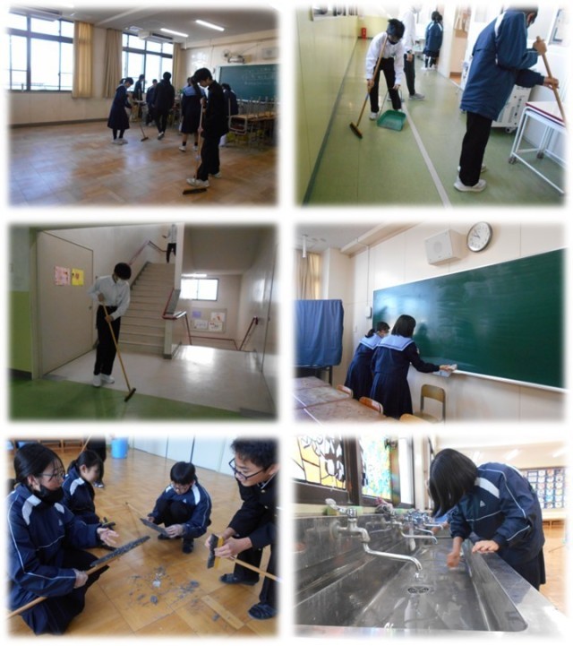 2時間目は大清掃です。教室や廊下、トイレ、特別教室などを隅から隅までキレイにしました。それにしても皆さんとても一所懸命頑張っていて感心します。きっと心もピカピカになったのではないでしょうか。3学期、キレイな環境でまたしっかり勉強していきましょう!