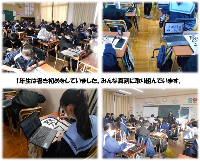 1年生は今年の目標を書き初めしています。1文字から4文字までの漢字を選んで書くのですが、とても個性が出ていました。静かに真剣に取り組んでいる姿を見ると、もうすぐ先輩になる自覚も出てきているのかなというふうに感じました。