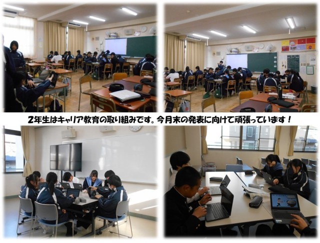 2年生は11月から始めたキャリア教育の続きを行っています。各グループに分かれ、Canvaを利用してプレゼンテーション資料を作成していました。年末にお手紙でもお知らせしましたが、今月末の1/30(金)に体育館発表会があります。保護者のみなさまにもぜひご覧ください。
