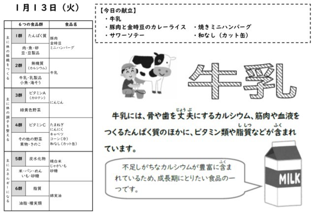今日はみんな大好きカレーとハンバーグという組み合わせという献立だったので新年からテンションがあがった人も多いのではないでしょうか。給食で出てくるカレーの具材はバラエティに富んでいていつも楽しみなのですが、今日の金時豆もなかなかユニークで美味しかったです。最近では冬野菜カレーのときに大根やれんこんが入っていたのも美味しかったですね。