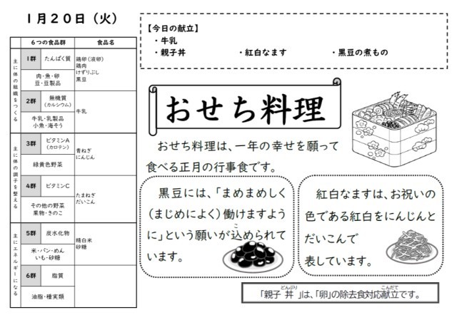 「なます」は細かく切った食材を酢や砂糖などで和えた料理です。元々は中国から伝わった生肉・生魚料理が日本で変化したもので、語源は「生肉(なましし)」が転じたものだそうです。おせち料理では紅白の彩(いろどり)から「紅白なます」または「源平(げんぺい)なます」と言います。なぜ“源平”かというと、平安時代末期の源平合戦において源氏は白い旗、平氏は赤い旗を掲げたことから由来しています。結局、この戦いは平氏が壇ノ浦で滅亡して源氏が勝利しましたが、その源氏も3代で途絶えてしまいます…まさに「諸行無常(しょぎょうむじょう)」ですね。ちなみに、このあたりの内容は1年生の歴史(源平合戦)や2年生の国語(『平家物語』)で学習します。