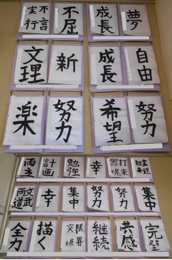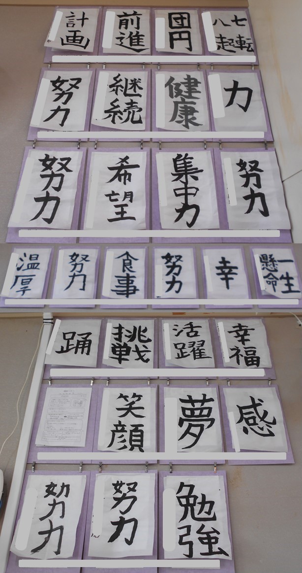 1月10日に1年生が取り組んでいた書き初め、遅くなりましたが作品をご覧ください。どの作品も個性があふれ出ていますね!(※撮影の加減で文字の大きさに差が出てしまい申し訳ないです)。