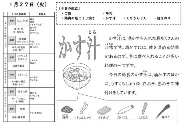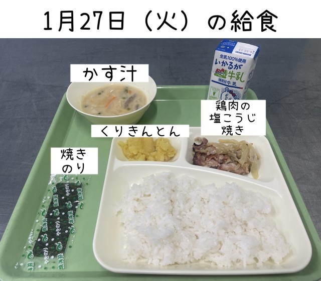 今日の給食で出た栗(くり)きんとんは、おせち料理でもおなじみの献立です。漢字で「栗金団」と書き、その鮮やかな黄色が金の塊(かたまり)や小判(こばん)を連想させることから、金運や財産が豊かになることを願う縁起物(えんぎもの)となっています。また、その実を砕いたものを「搗ち栗(かちぐり)」と言い、「勝ち」に通じることから勝負運がアップする縁起物とされています。歴史的にも栗は武士の保存食や縁起物として大切にされ、戦(いくさ)に出る前には栗などの縁起物を食べてお酒を飲み、「えい、えい、おーっ」と気合を入れる儀式も行っていました。栗についてはまだまだ語りたいことがありますが、それはまた今度の機会に…。