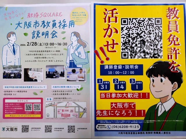 大阪市教育委員会では、令和9年度教員採用選考テストの概要や大阪市の教育の魅力を広く発信するため、「教採SQUARE(大阪市教員採用説明会)」を2月28日(土)に開催いたします。また、学校園で講師として勤務することにご関心のある方を対象とした「講師登録・説明会」を1月から3月にかけて実施いたします。
