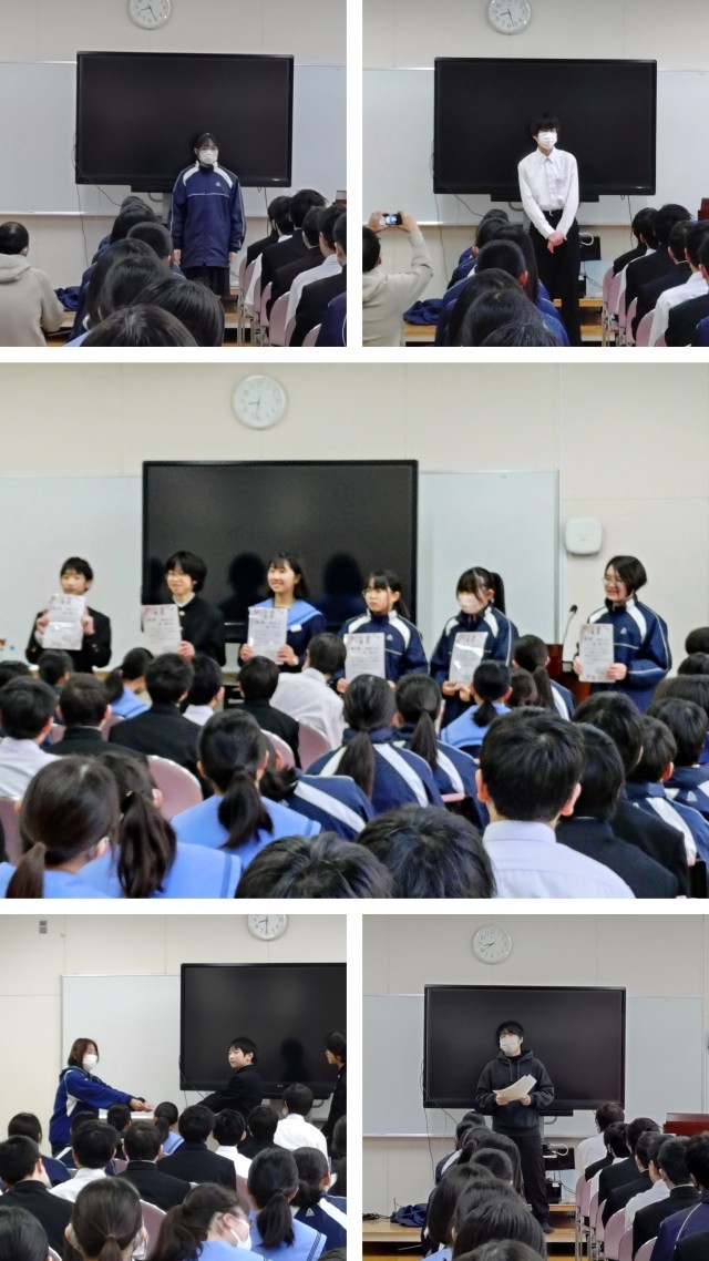 今朝は、1年生の学年集会があり、昨日開催された『百人一首大会』の表彰(個人の部)が行われました。「入賞者の皆さん、おめでとうございます!」クラス優勝は1組でしたが、取った札の総枚数では3組が1位、一番多く札を取った班は2組と、「どのような試合の方式で行うのかで順位が変わる接戦であった」とのこと。また、「百人一首の取組がスタートしてから昨日の本番までの過程が大切で、隙間時間で少しでも覚えようとした姿勢がとても良かった。」というお褒めの言葉もありました。