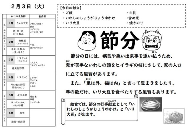 今日は節分の行事献立で「いわしのしょうがじょうゆかけ」と「いり大豆」が出ました。そもそも「節分」とは立春(りっしゅん)・立夏(りっか)・立秋(りっしゅう)・立冬(りっとう)の各前日を指し、季節の変わり目に生じる邪気(じゃき)=鬼を払う行事です。今もそうですが、季節の変わり目というのは体調を崩しやすいですよね。昔の人は病気を鬼のしわざと考えたので、いわしの強いにおいで鬼を追い払い、豆をまいて「魔(ま)」を「滅(め)」っしたわけです。