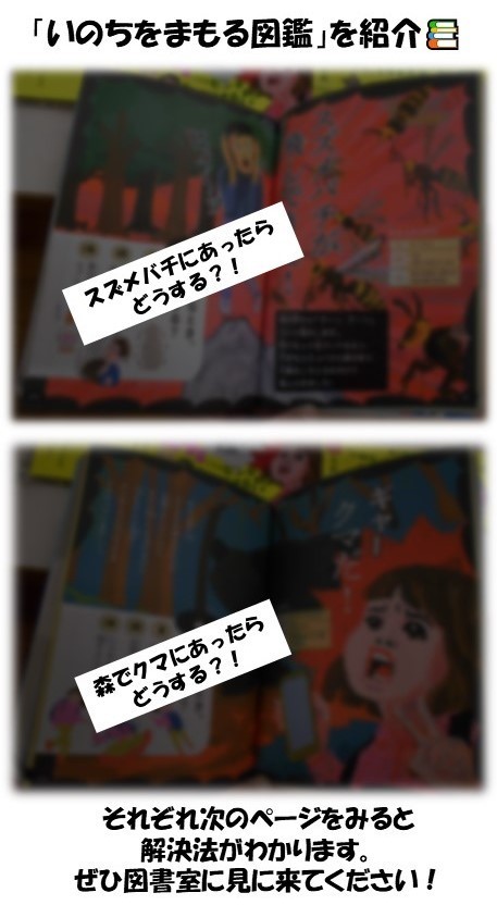 図書室に入ってすぐのところに新刊コーナーがあり、面白そうな本が並んでいたので超主観で紹介してみようと思います。今日は「いのちをまもる図鑑」。あなたは危険生物や危険動物に遭遇(そうぐう)したとき、どうしますか?この夏はクマ被害が多かったことを覚えている人も多いと思います。危険な目にあわずに済めばいいですが、そうとも限りません。そんなときにこの“最強のピンチ脱出マニュアル”を読んでおくときっと役に立つこと間違いなし!(知らんけど)。ピンチの脱出方法については、図書室に来て実際に手に取って確認してみてくださいね。