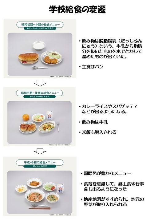 最初に宣言しますが、今日の献立にちなんだネタはありません(´;ω;`)ウッ… ハヤシライスもいもけんぴもすでに話題に出してしまいましたので、今日は農林水産省のホームページにあった「昭和から令和まで、年代別にみる学校給食の変遷」について紹介したいと思います。