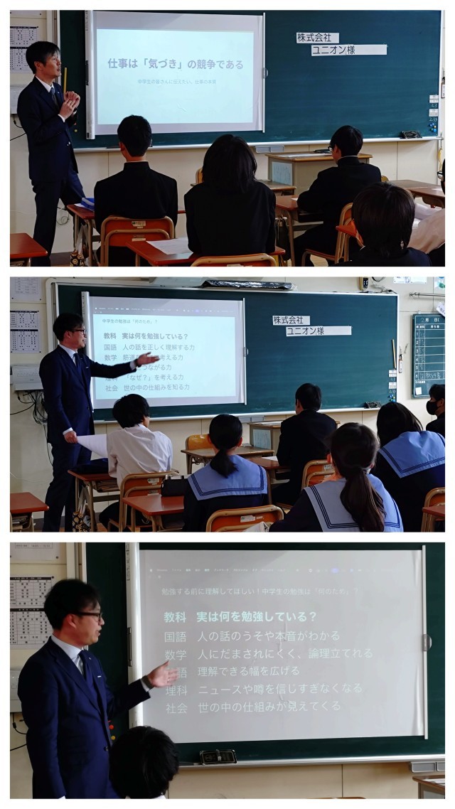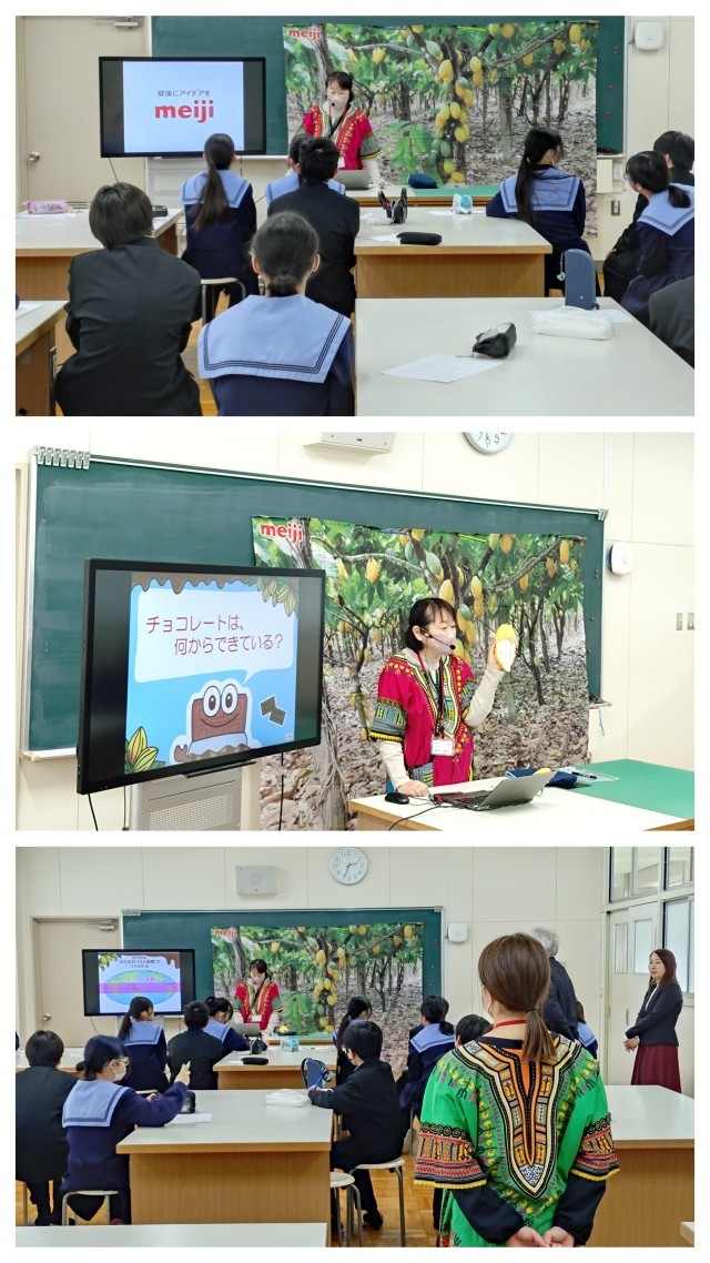 上の写真から『株式会社明治』・『資生堂ジャパン株式会社』・『株式会社ユニオン』の方々です。特に、女子生徒たちのお肌への関心は高いようで、まるで「美容セミナー」のような場面も!楽しそうでした。また、講話の最後に、あま~い〇〇〇〇〇〇をもらったラッキーなグループもあったようです。「うらやましっ!」