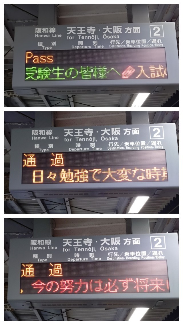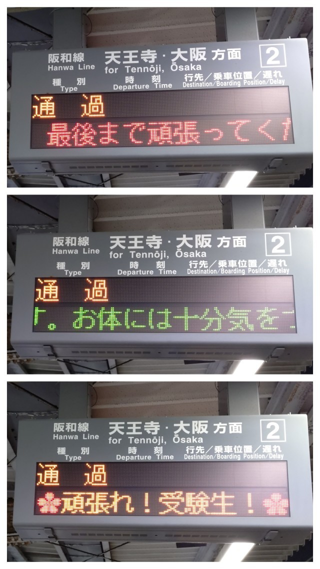 中学校から一番近い南田辺駅の電光掲示板に、受験生に向けた優しさ溢れるメッセージが流れていました。「これは、きっと昭和中学校の3年生に向けての激励ですよ。応援、嬉しいですね!」