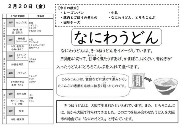 さて、今日の献立に「なにわうどん」が出たのでうどんに関するトリビアを紹介します。世の中には「三大○○」というのがありますが、「日本三大うどん」は何うどんが思い浮かびますか?一般的には香川の「讃岐(さぬき)うどん」、秋田の「稲庭(いなにわ)うどん」に加えて、長崎の「五島(ごとう)うどん」または群馬の「水沢(みずさわ)うどん」を加えた3つを指すようです(諸説あり、異論は認めます)。香川は「うどん県」を名乗っているぐらいですから消費量は圧倒的に日本一を誇り、コシが強いのが特徴ですね。稲庭うどんは細めでなめらかなのど越し。五島うどんは椿油(つばきあぶら)を練りこんだ細麺で、熱々の鍋からうどんをすくってあごだし(トビウオの出汁)で食べる「地獄炊き」が有名です。水沢うどんは伊香保(いかほ)温泉周辺でつくられ、コシがあってつるりとした食感が特徴です。