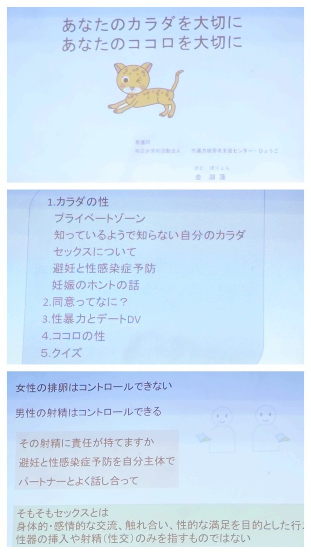 本日、5限目には3年生を対象にNPO法人性暴力被害者センターひょうご運営委員の金 湖蓮(キムコヨン)看護師をお招きして『カラダの性』や『性感染症』など、子どもたちが今後生きていくうえで大切な性に関わるお話を聴くことができました。休憩後の6限目には、『性暴力やデートDV』のお話があるようです。