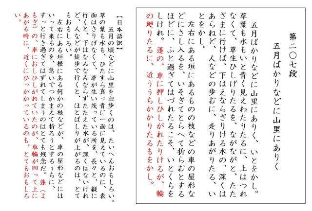 春の訪れを感じるよもぎですが、平安時代の女流作家・清少納言(せいしょうなごん)もその著書『枕草子(まくらのそうし)』でよもぎについて触れています。第207段「五月(さつき)ばかりなどに山里にありく」では、春を迎えたある日、外出した清少納言が自分が乗った牛車(ぎっしゃ)の車輪にふまれた道ばたのよもぎの香りに春を感じて、「おかし」(=おもむきがある)と記したという一節があります。2年生で「春はあけぼの…」の冒頭部分を覚える『枕草子』ですが、けっこう面白い話が多いのでまた紹介できればと思います。