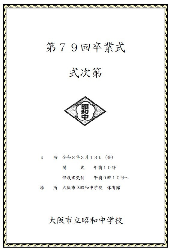 卒業式は、本来であれば多くの方々にご参列いただき、門出を祝していただく場ではございますが、会場の座席数に限りがあるため保護者席を優先して確保させていただいております。そのため、在校生の参列は2年生のみとさせていただきます。なにとぞご理解とご協力のほど、よろしくお願いいたします。