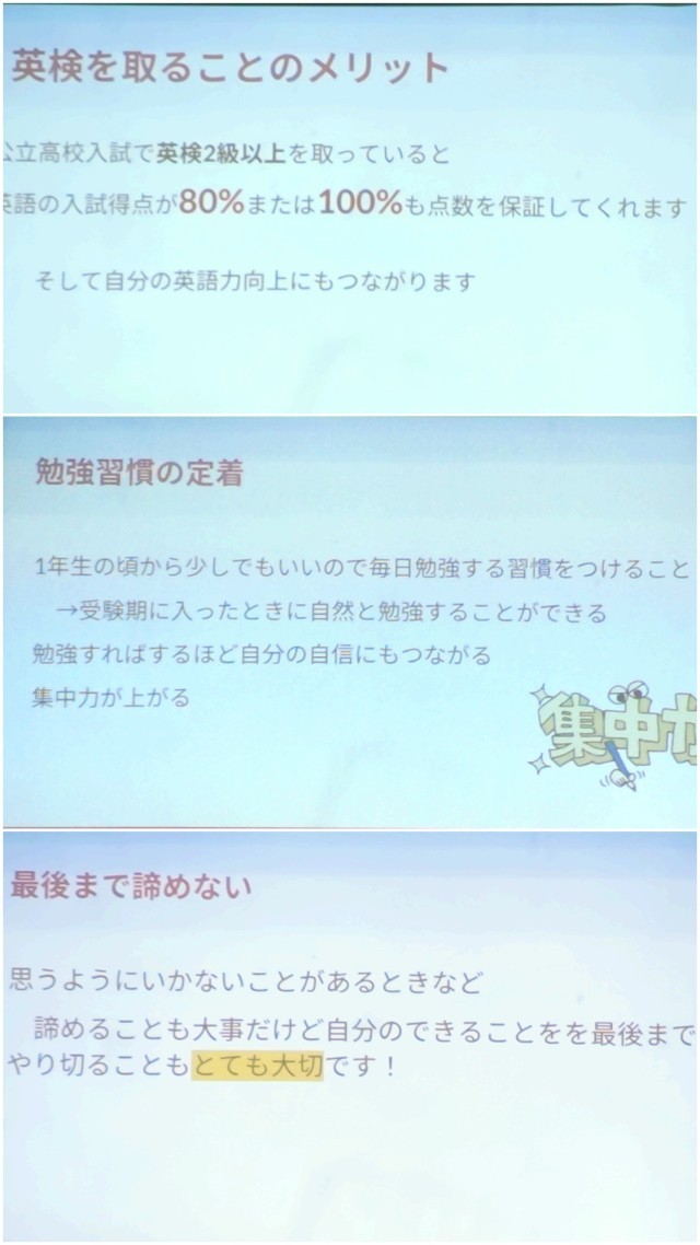 清水谷高校のYさんからは、『進路決定』に向けてのお話がありました。「とにかく高校について調べる」「オープンキャンパスには参加する」「英検は取得する」など、かなり具体的な助言がありました。勉強習慣の定着ついては、「勉強は、毎日少しでよいので行う」「勉強をやることで自信にもなり集中力が高まる」「そして最後まであきらめないでやりきる」「時に息抜きも必要」であるようです。
