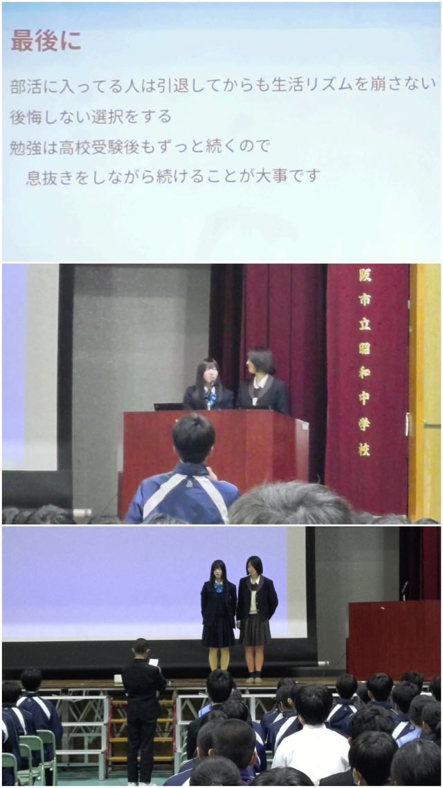 『質疑応答』の時間では、「苦手な教科の勉強ってどうしたら良いの」や「高校に入って良かったことを教えてください」などの質問に丁寧に答えられていました。『卒業生講話』終了後、ベテラン教員が2名の高校生に「めちゃくちゃ上手いこと説明するやん!」「ええ、勉強になったわ(高校生に教えられた)」と感心しておられました。「本日、講話をしていただいた2名の高校生の皆さん、本当にありがとうございました」
