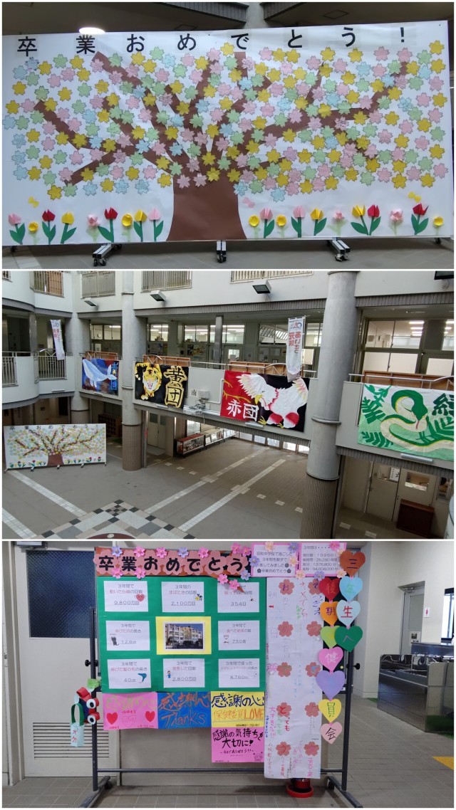 午後からは会場準備となりましたが、素晴らしい会場に仕上がり、ピロティーも卒業の雰囲気満載でありました(写真)。明日の天気予報は、『曇時々晴』降水確率10%とほぼ心配はありません。感動の卒業式になることを願っています。