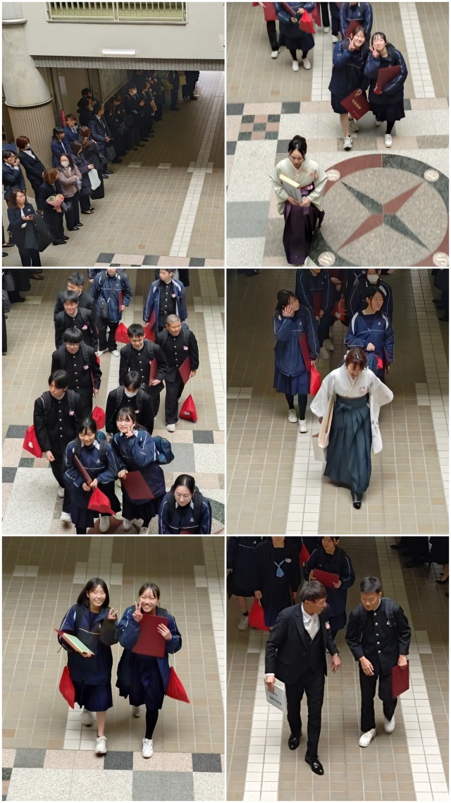 『卒業式』終了後、体育館前からピロティ・玄関にかけて、保護者の皆さんと在校生で花道を作って卒業生をたくさんの拍手で見送りました(上の写真)。「おめでとう!」