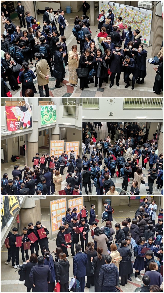 感動の『卒業式』のあと、ピロティでは笑顔いっぱいの卒業生の姿が印象的でした。泣いて、笑って、喜んで、3年間の思いが凝縮した一日となりました。