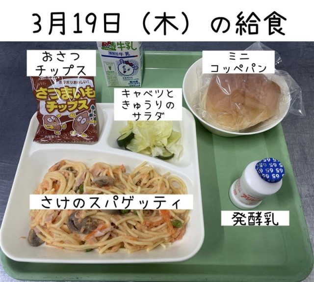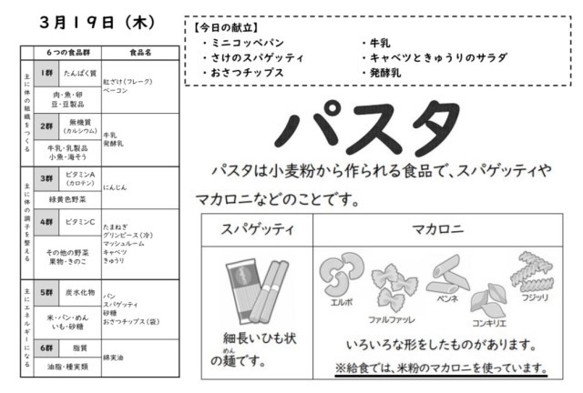 今日の献立はさけ(鮭)のスパゲッティでしたね。スバゲッティ(spaghetti)という言葉はイタリア語のスパゲット(spaghetto)の複数形で、「ひも」を意味するスパーゴ(spago)に由来します。これに「小さい」「少し」を意味する「etto」がついてできた言葉、つまりスパゲッティはイタリア語で「少し細いひも」という意味なんですね。