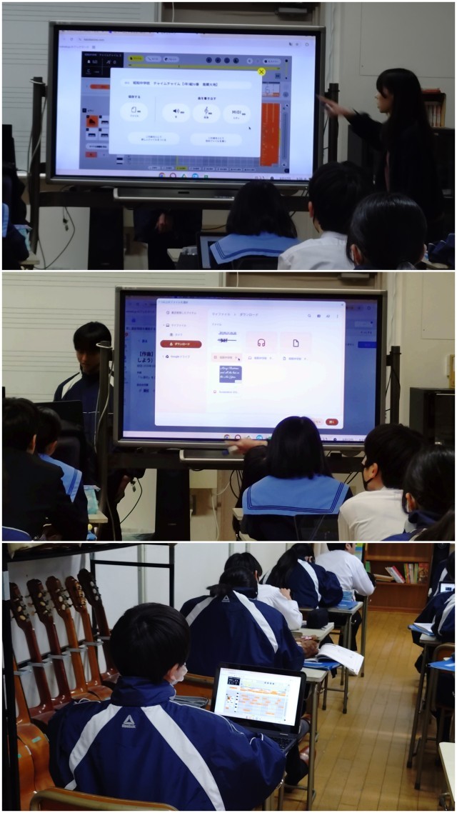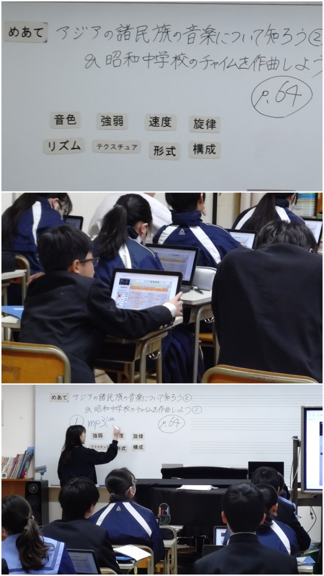パソコンを使って、昭和中のチャイムを作曲しようという授業でした。担当の先生からは「作られた曲は、とてもレベルが高い」とのことでした。「すごっ!」