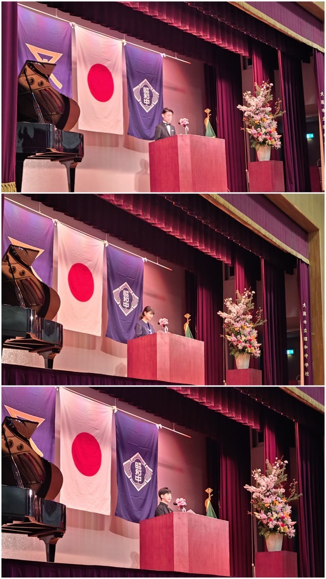 本日、令和8年度の『入学式』を挙行しました。入学生徒95名が出席し、在校生として新2年生と生徒会役員が式に出席しました。市会議員・阿倍野区長をはじめ30名近い来賓の方々にも参列していただき盛大に式を執り行うことができました。
