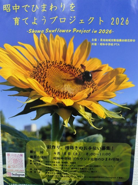 今週末の4月18日(土)8時より、『ひまわりプロジェクト2026』の取組を行います。集合場所は、昭和中学校グラウンド北側のひまわり畑です。
