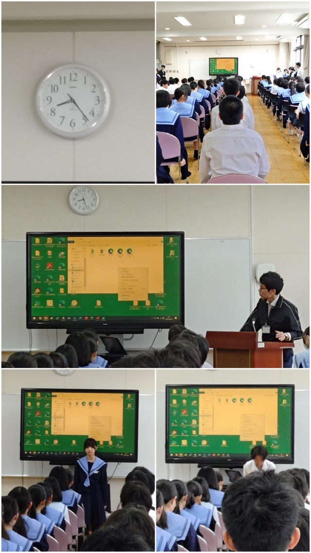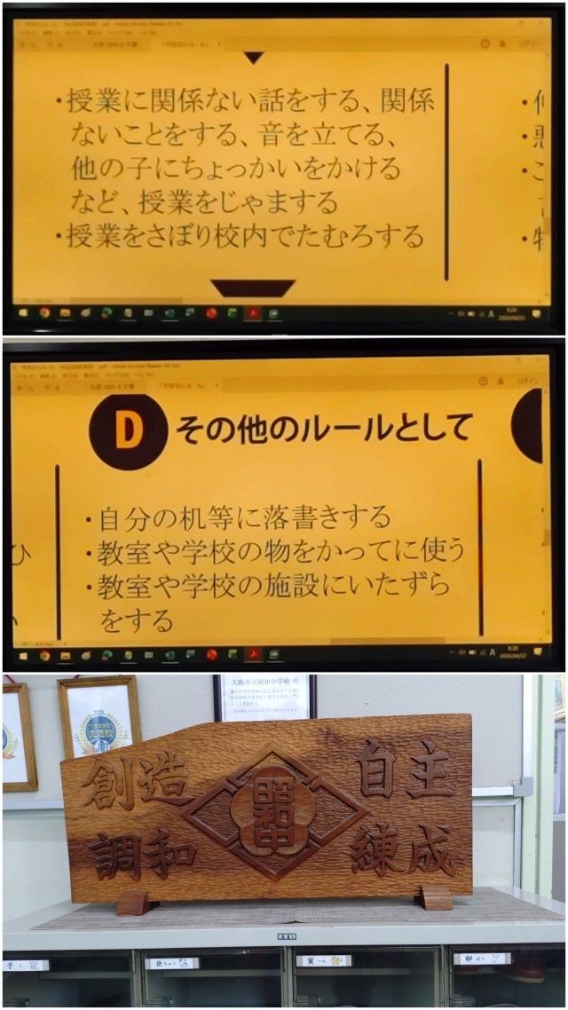 最後に昭和中学校の校訓(「自主」「練成」「創造」「調和」)についても触れられ、「AIなどを活用して、自分なりにどのような意味があるのかを調べてみてほしい」といった内容のお話がありました。