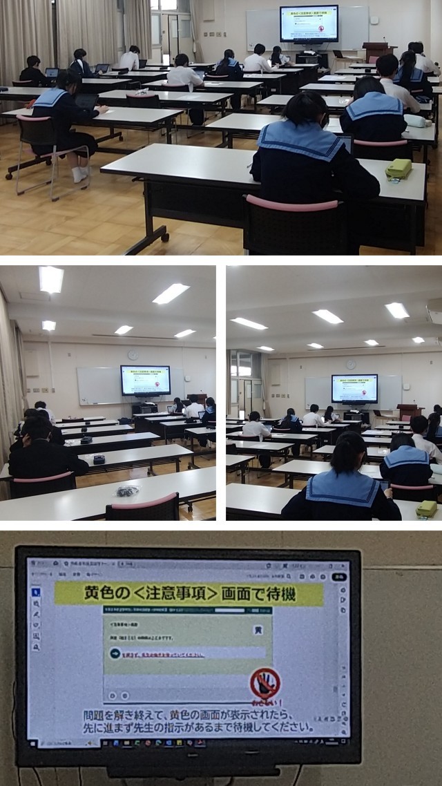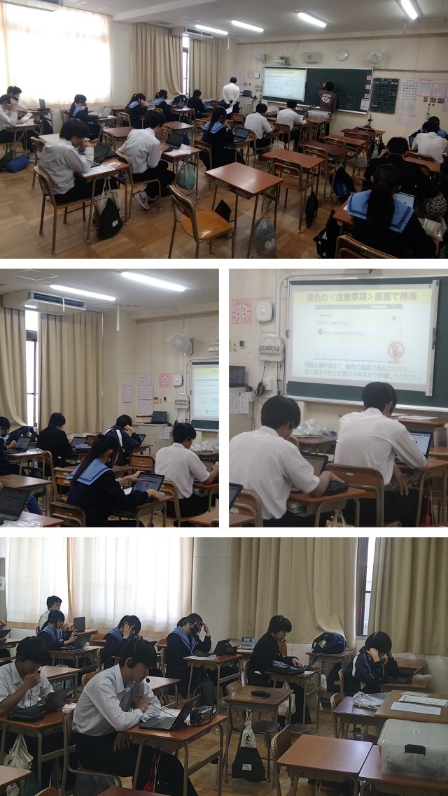 本日、3年全国学力・学習状況調査(英語「話すこと」)を1・2限の時間帯で教室と多目的室な2グループに分けて行いました。端末のトラブルもなく、今のところ順調に進んでいるようです。