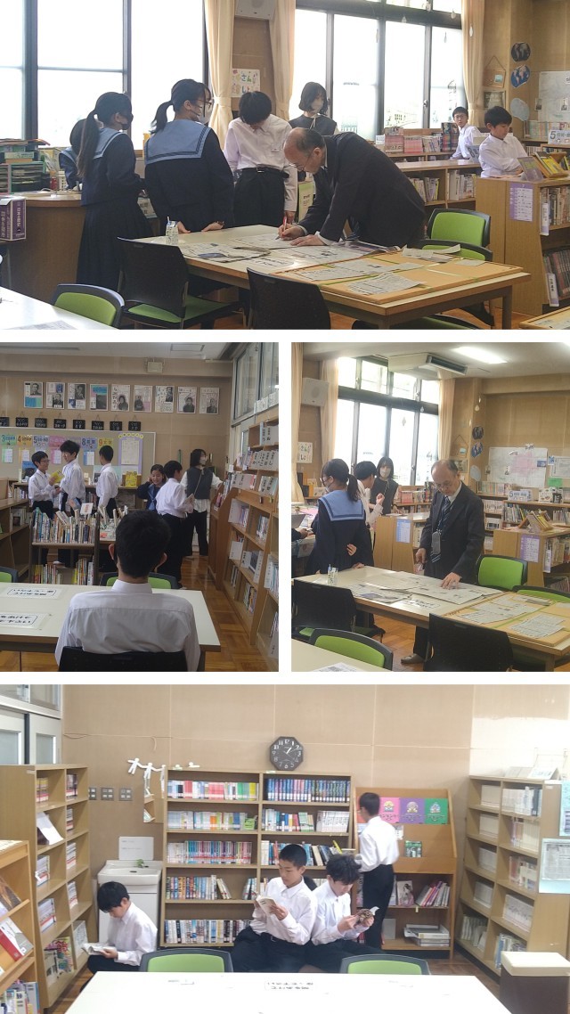 図書室の利用について学校司書より説明を受けた1年生が多くの本を借りていました。「生徒の皆さん、図書室をどんどん利用しましょう!」