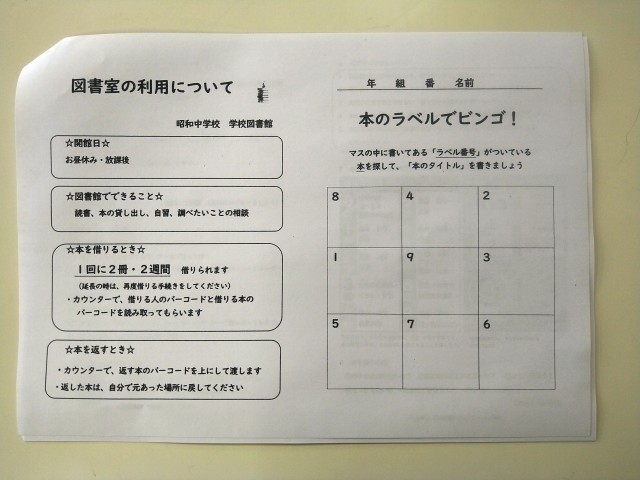 今日から図書の貸出しが始まりました。借りた本のラベル番号での『ビンゴゲーム』もあるようです(下の写真)。