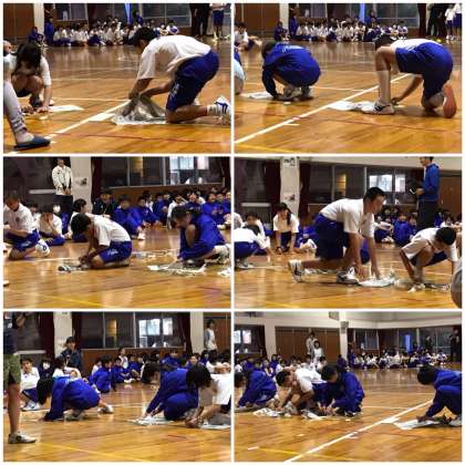 班員6人が作戦を練り、新聞紙をちぎります。交代のときの全力疾走にも注目でした。