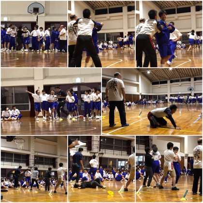 担任の先生に10回してもらいバトンタッチ。班員6人が繰り返します。最後は、担任の先生が生徒の元へ走っていき15回転。元の位置に戻ってフラッグを取ります。