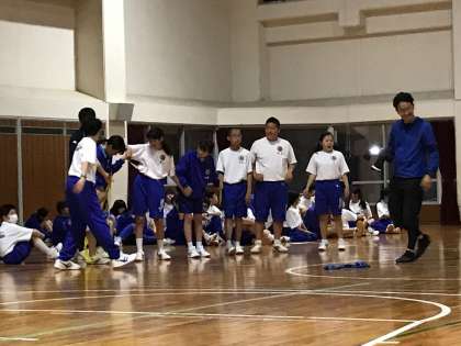 班員6人が手をつなぎ、端からタスキをくぐります。身体をくねくね、なかなかタスキが移動してくれません。悪戦苦闘でした。