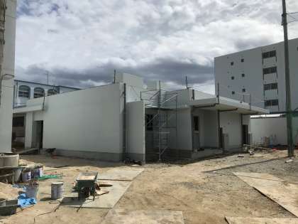 まだ、内装工事や機材の搬入、建物の周りの整備はできていませんが、2学期からの給食開始に向け着実に工事が進められています。