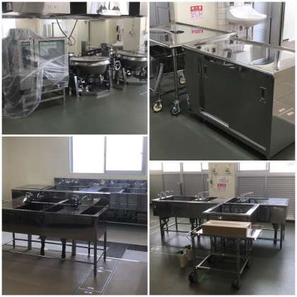 中に入ってみると、厨房機器が据え付けられていました。冷蔵庫や食器保管庫などはまだ据え付けられていません。今後、順次据え付けられ8月27日の給食実施に向け準備を整えていきます。