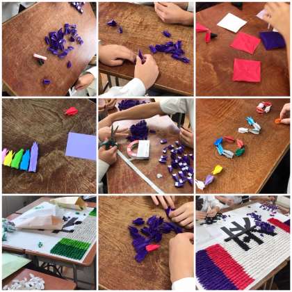 文化祭に向けての準備が始まっています。3年生は、千羽鶴を用いての作品づくり。