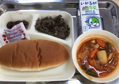 鶏肉とじゃがいも、玉ねぎがよく煮込まれたケチャップ煮。給食が始まってから熱々のホクホクの汁物を食べることができています。給食、美味しいです。
