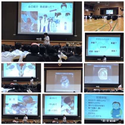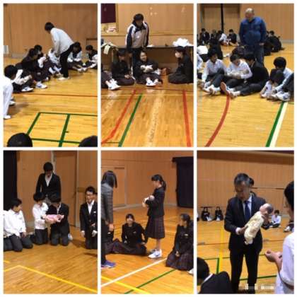 1年生は今日、土曜授業で助産師の伊藤さんに来ていただき、ティーンズセミナーとして性教育を学習しました。生命の誕生から、クラス代表が妊婦体験。そして約3,000gの赤ちゃん人形を全員が抱く体験をしました。