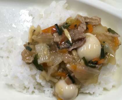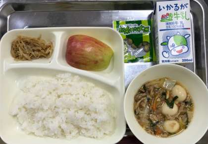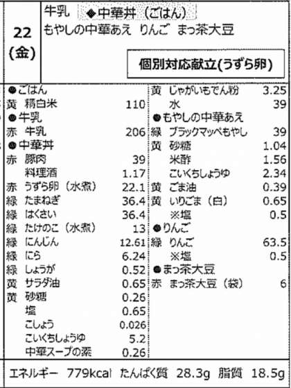 今日のメニューは、「中華丼」。はじめ具材がお椀に入っていたので、なんの違和感もなくそのままおかずとして食べていました。(写真上)