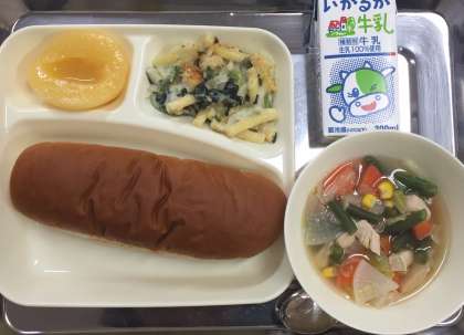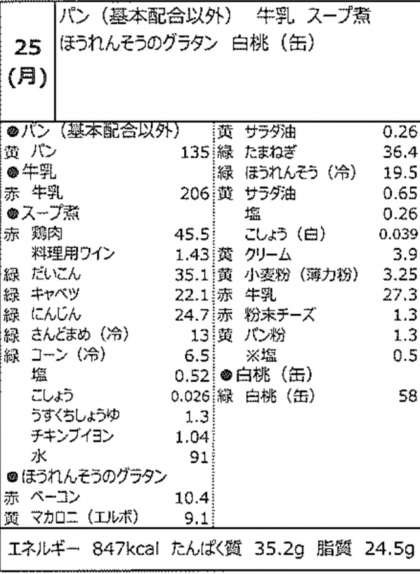 ほうれん草のグラタン、大きな容器に入って各教室に運ばれて来ます。大きなサービススプーンで取り分けますが、これがなかなか難しい。